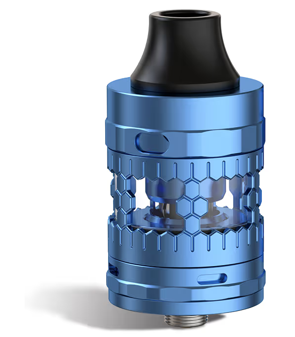 Mavi Aspire Atlantis GT Kartuş, petek desenli metal gövdeli ve siyah drip tip.