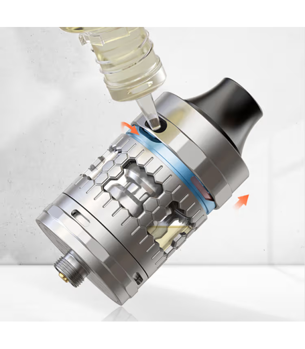 1. Üst kapağı çevirerek dolum deliğini açın. Şemsiye yapısı e-likiti coil’e temas etmesini engeller.