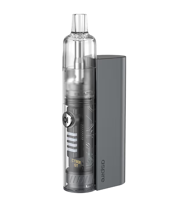 Aspire Cyber GT Pod Mod gri, şeffaf tanklı modern elektronik sigara.
