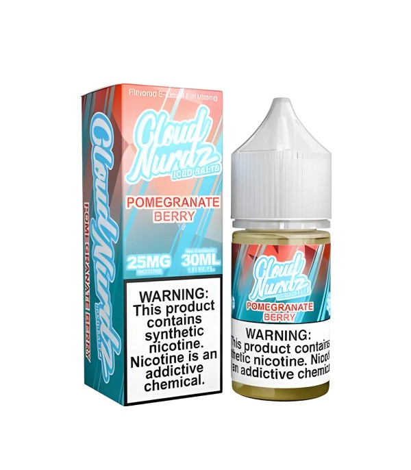 Cloud Nurdz Pomegranate Berry Iced Salt Likit, taze nar ve karışık orman meyvelerinin aromalarını buz ferahlığıyla birleştirir. 30 mL, 25 mg / 50 mg nikotin seçenekleri, 60VG/40PG oranı.