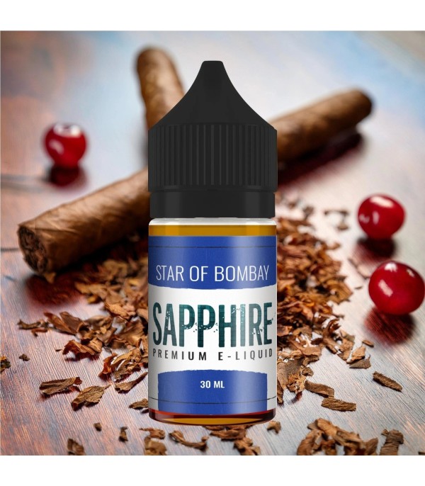 Sapphire Star of Bombay Premium E-Liquid 30 ML şişesi tütünlü arka planda.