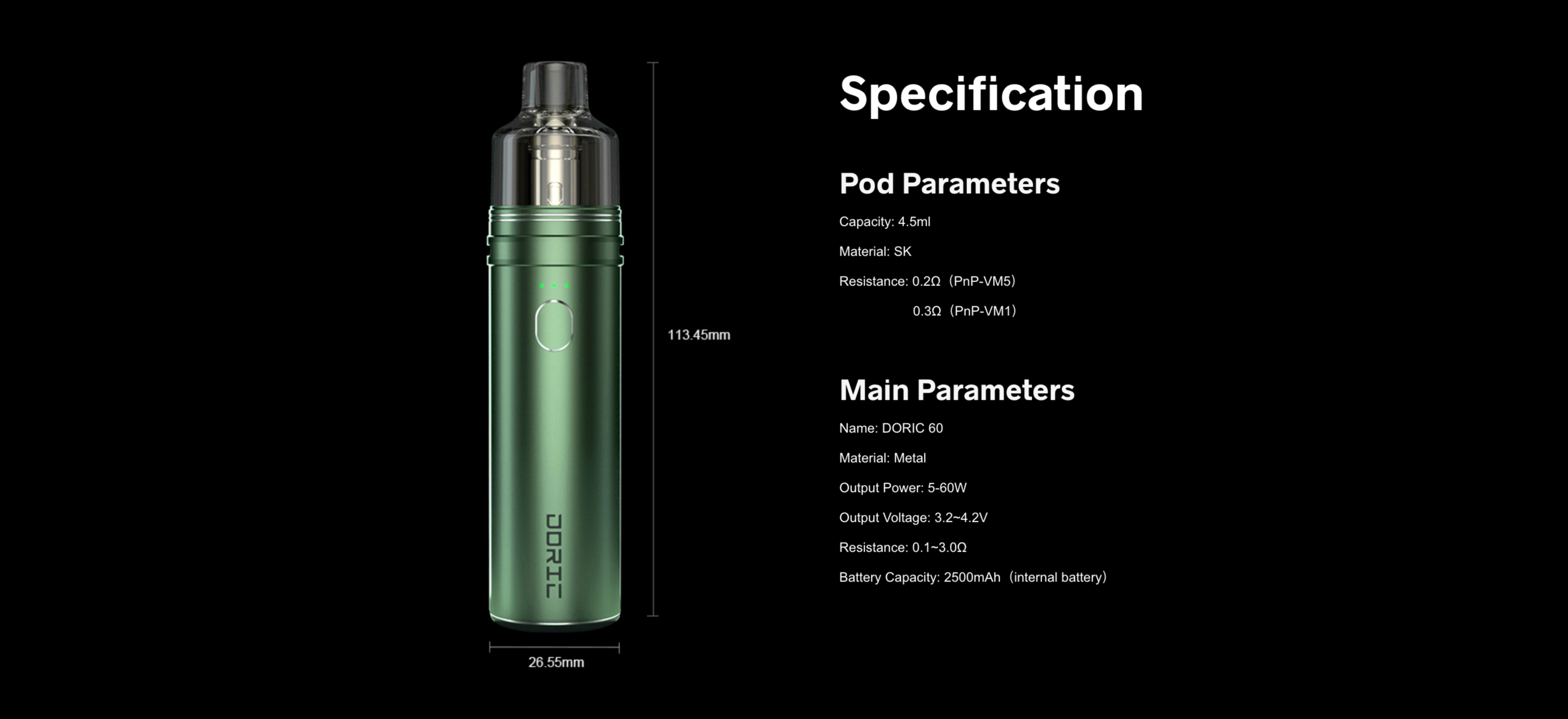 2500mAh dahili pil ve USB Type-C hızlı şarj özelliği ile donatılmıştır. 5-60W çıkış gücü sağlayan Voopoo Doric 60, GENE çipi sayesinde güvenilir bir performans sunar.